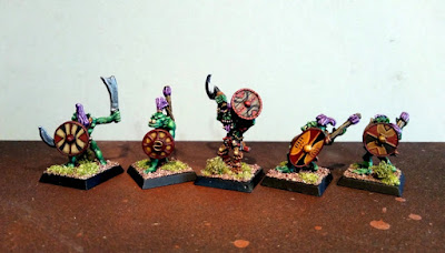 These are gonna work as "Skulks" unit in my Kings of War army. Completely useless in game terms, but they're looking good :)